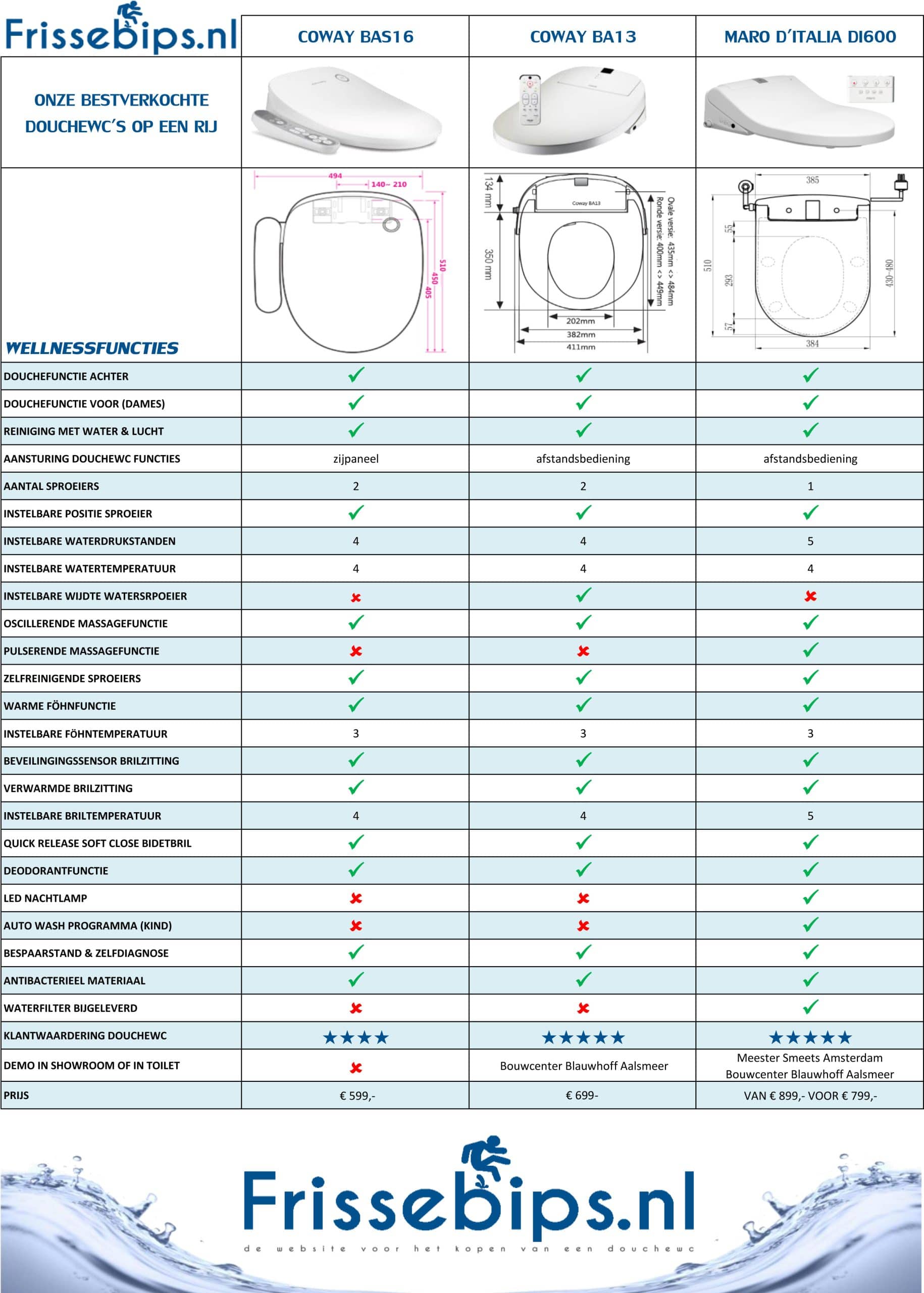 Bij frissebips.nl begrijpen wij best dat het lastig kan zijn het juiste bidet toilet te kiezen. Naast dat iedere spatoilet verschillende wellnessfuncties heeft, wilt u graag ook weten wat het comfort is van de Japanse douchewc’s, maar ook of de bidebril past op uw huidige of juist nieuwe toiletpot. Het “vergelijk bidet toilet” overzicht van Frissebips biedt uitkomst en zet onze beste douchewc’s naast elkaar. In dit handige overzicht kunt u in een opslag de functies van alle douchewc’s vergelijken, bekijken wat de kenmerken/specificaties zijn en de pasformaten van de douchewc’s.